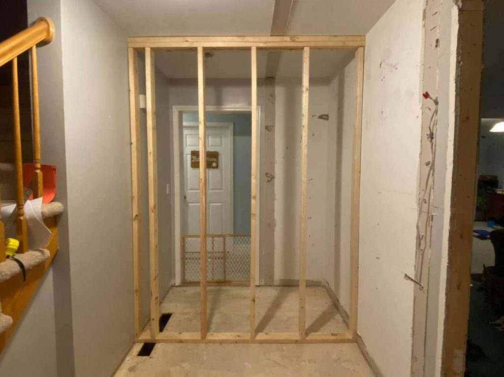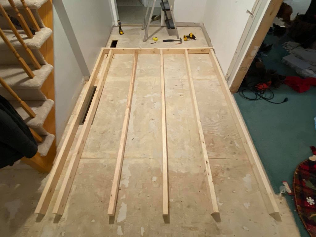 ‪This is the wall separating the new closet and pantry. The board on the ground closest to the front door is where the front closet wall/doorway will stand. The front closet will be 24" deep, and the pantry will be about 36" deep. The wall is 72" wide, and the closet doors will be 60" wide. Since the pantry is about 3’ x 6’, I’m planning to install 12" shelving along the long back wall and 18" shelving along the short side wall.